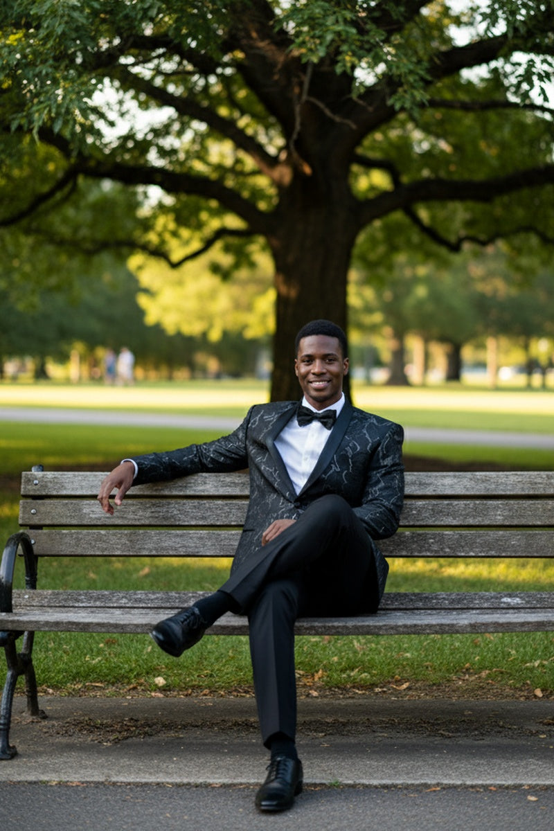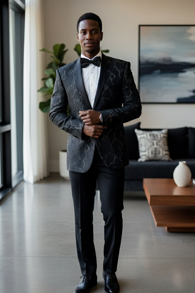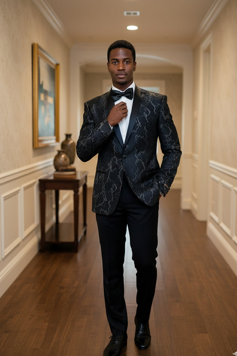 "Havana" Black Tuxedo Jacket, designed by Xander Xiao, is crafted using a beautiful woven fabric in an intricate modern floral pattern.