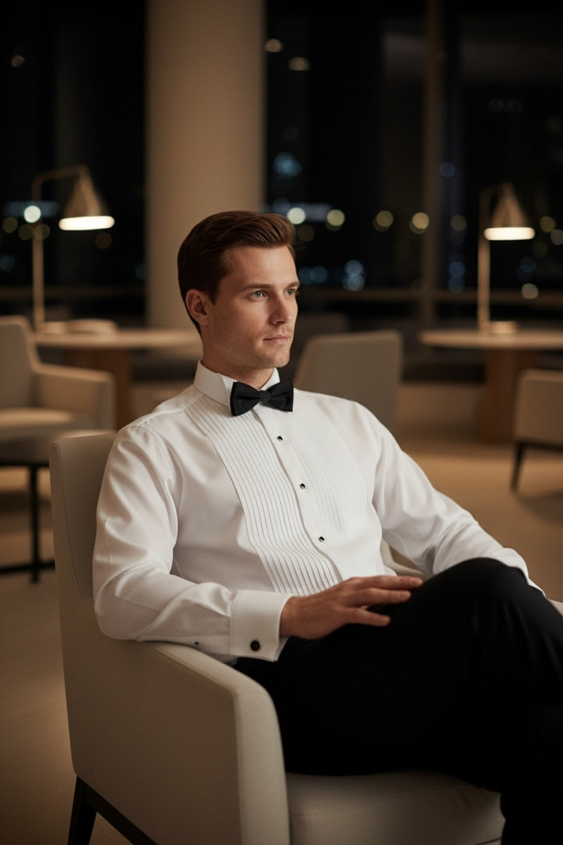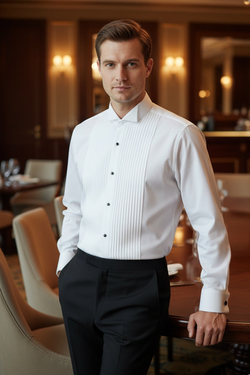 For the gentleman who appreciates tradition and the purity of a tuxedo look, we direct your attention to the "David" White Wingtip Tuxedo Shirt. The traditional wingtip collar is ready to serve as an effective backdrop for your bow tie. The formal vertical pleats, spaced 1/4 inches apart, flow down the entire length of the shirt (TIP #157: full length pleats are always better than bib length pleats).