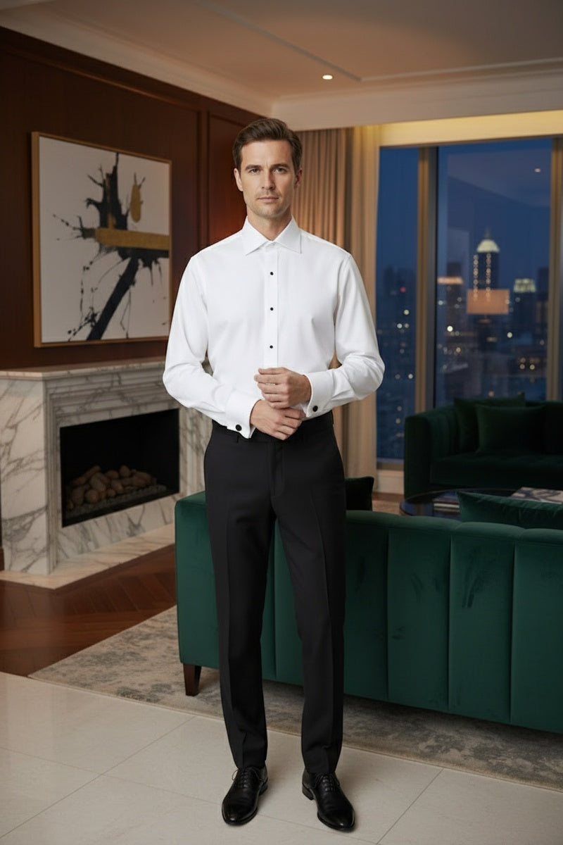 The "Richard" White Spread Collar Shirt is one of our most popular tuxedo shirts ... and for good reason. The 100% cotton broadcloth fabric is soft, lightweight, breathable and comfortable. Break-stitch resistant buttons and single-needle tailoring showcase the attention to detail and premium craftsmanship. A Flex Fit collar provides the desired level of comfort around the neck.