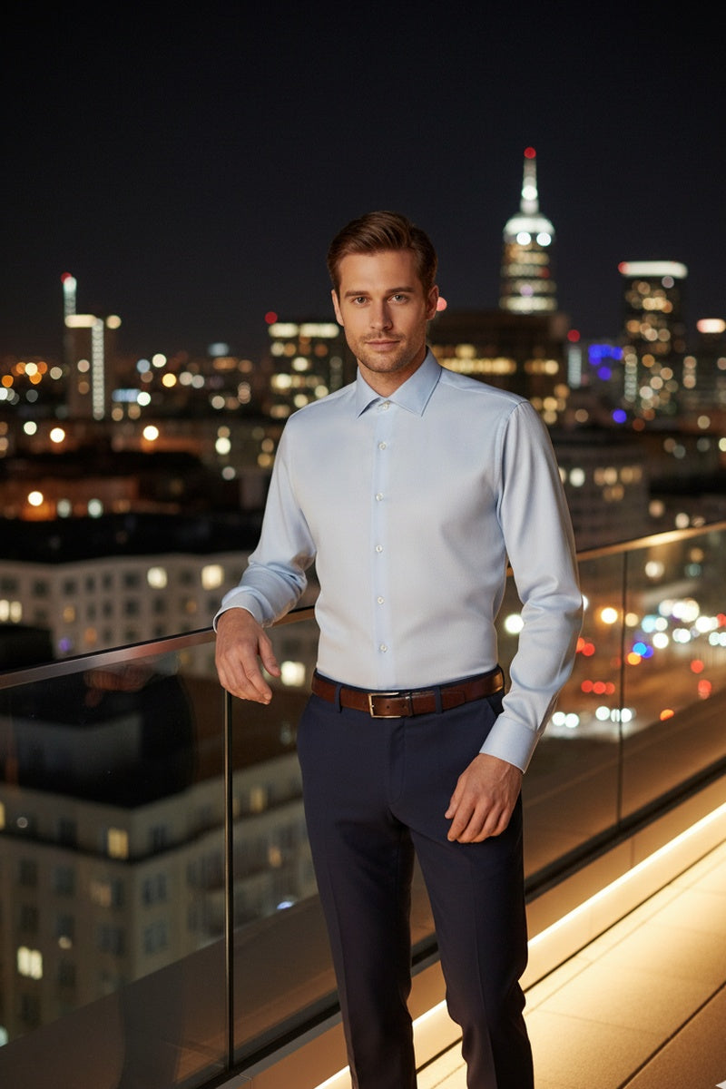 The "Jamison" Blue Spread Collar Shirt is a perfect shirt to go with a wedding suit. The 100% cotton twill fabric has a beautiful subtle diagonal texture and is soft, lightweight, breathable and comfortable. Break-stitch resistant buttons and single-needle tailoring showcase the attention to detail and premium craftsmanship. A Flex Fit collar provides the desired level of comfort around the neck.